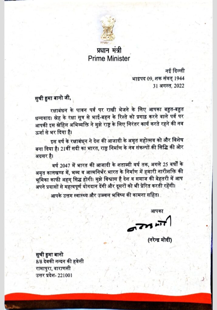 वाराणसी | काशी क्षेत्र की तेजतर्रार भाजपा नेत्री एवं भाजपा अल्पसंख्यक मोर्चा के काशी क्षेत्र की क्षेत्रीय मंत्री हुमा बानो व उनकी महिला टीम द्वारा भाई – बहन के इस पावन पर्व रक्षाबंधन के अवसर पर देश के प्रधानमंत्री नरेन्द्र मोदी को भेजी गई थी राखी(रक्षा सूत्र)। मुस्लिम महिलाओं द्वारा भेजी गई राखी को कबूल करते हुए देश के प्रधानमंत्री नरेन्द्र मोदी द्वारा पत्र के माध्यम से दी गई राखी भेजने वाली महिलाओं को रक्षाबंधन की बंधाई व शुभकामनाएं।