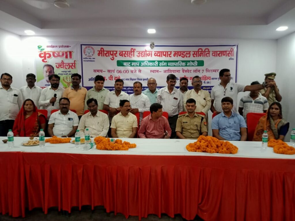 वाराणसी| मीरापुर बसही उद्योग व्यापार मंडल समिति द्वारा बाट माप विभाग के जिला प्रभारी एनपी दुबे तथा सहायक पुलिस आयुक्त कैंट मनीष कुमार शांडिल्य के साथ ‘व्यापारी गोष्ठी’ का आयोजन अध्यक्ष मृत्युन्जय सोनकर के नेतृत्व मे व्यापार मंडल क्षेत्र के आशियाना बैंक्वेट लॉन मे आयोजित किया गया| इस कार्यक्रम मे व्यापारी से संबंधित बाट माप जानकारी अधिकारी के माध्यम से दिया गया, उसी क्रम में उनकी समस्याओं के बारे में सुना गया और समाधान भी बताया गया।