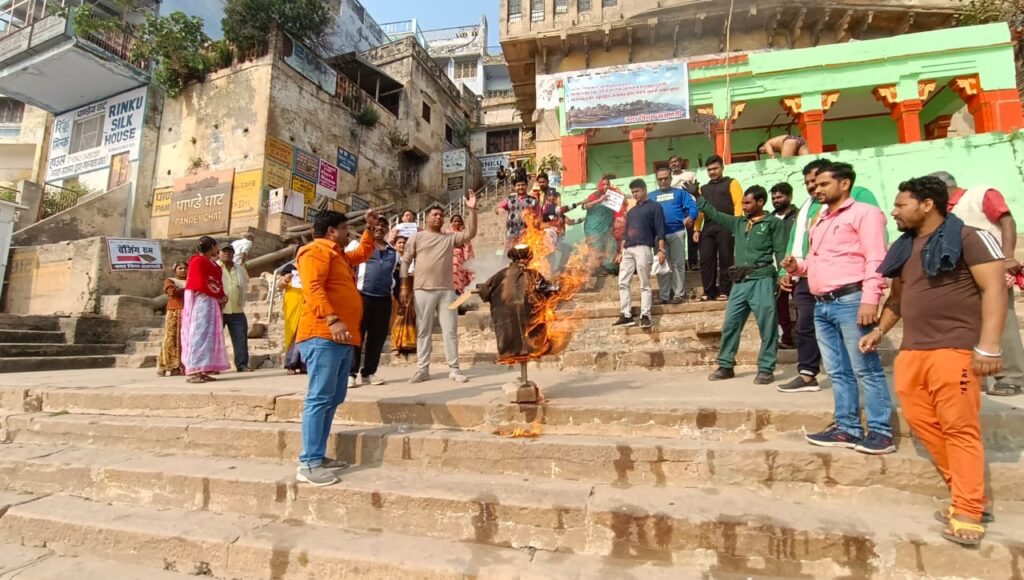 वाराणसी : अफताब द्वारा श्रद्धा को 35 टुकड़े कर फ्रिज में रखने का मामला प्रकाश में आते ही, अफताब के इस जघन्य आरोप को लेकर पूरे देश में आक्रोश देखने को मिला है। लोग अपराध को लेकर तरह-तरह के कयास लगा रहे हैं, तो दूसरी तरफ उसके खिलाफ कड़ी से कड़ी कार्रवाई की मांग कर रहे हैं। वही आज वाराणसी में भी अब तक इस घटना को लेकर महिलाओं में काफी आक्रोश देखने को मिला। महिलाओं ने अब तक का पुतला बनाकर पूरे एरिया में घुमाया जिसके बाद घाट पर ले जाकर दाह संस्कार किया। महिलाओं का साफ कहना था कि आफताब को फांसी की सजा दी जाए।